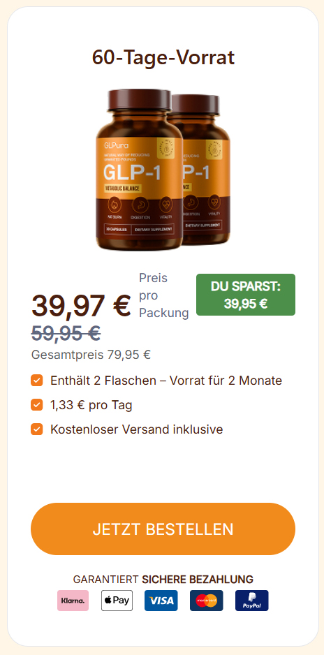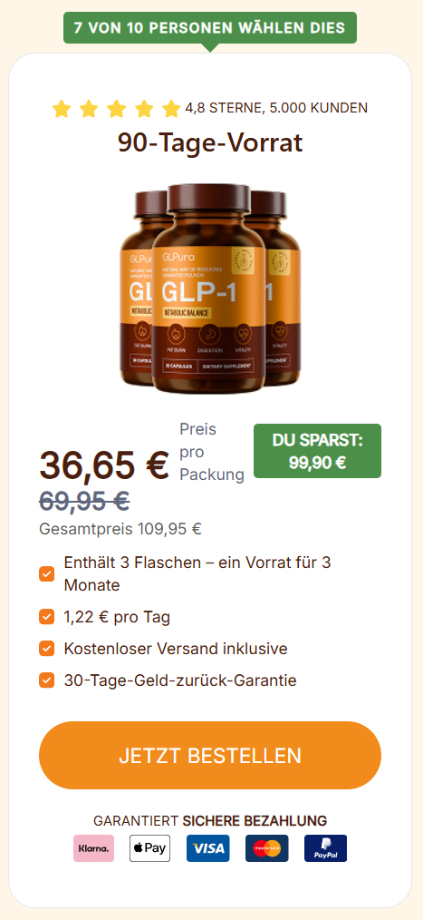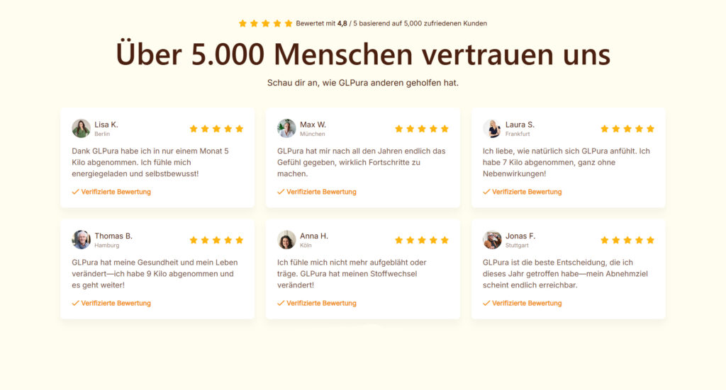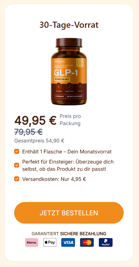 Individuelle Ergebnisse können variieren. Einige Anwender berichten, dass sie sich bereits nach kurzer Zeit ausgeglichener und energiegeladener fühlen. Die Unterstützung beim Gewichtsmanagement entwickelt sich in der Regel schrittweise – insbesondere dann, wenn GLPura mit einer ausgewogenen Ernährung und einem aktiven Lebensstil kombiniert wird.